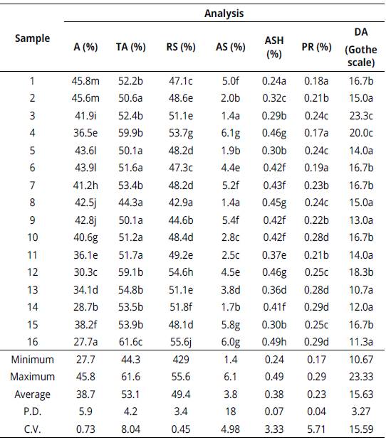 Results of free, lactonic and total acidities ranged from 23.37 to 61.54 meq.kg-1, 4.79 to 12.41 meq.kg-1 and 30.53 to 70.66 meq.kg-1 respectively, with average values of 35.73 meq. kg-1 for free acidity, 8.86 meq.kg-1 for lactonic acidity and 44.59 meq.kg-1 for total acidity. Among the 16 samples analyzed, only the sample 9 showed values out of the pattern according to the national standards (MAPA, 2000) (Table 2).