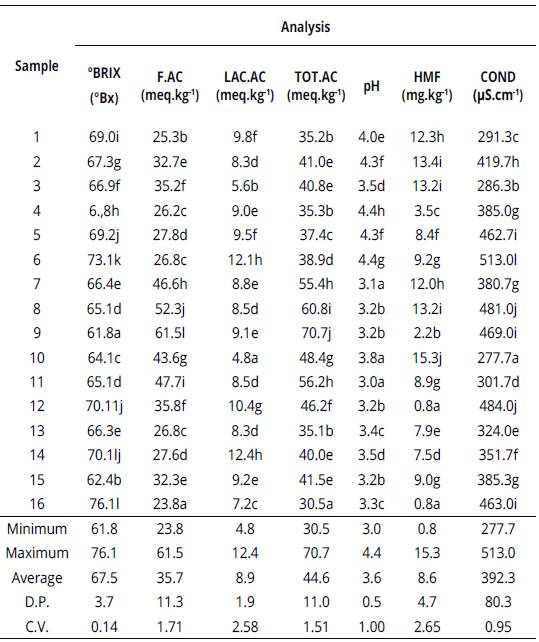 Same letters in the same column do not differ from each other, by the Scott-Knott test at 5% probability. °BX: Brix degrees; F.AC: free Acidity; LAC.AC: lactonic acidity; TOT.AC: total acidity; HMF: hydroxymethylfurfural; COND: electrical conductivity.
