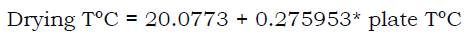 The output shows the adjustment results to the linear model to describe the relationship between Drying T°C and Plate T°C. The equation of the adjusted model is as follows (Equation 1):