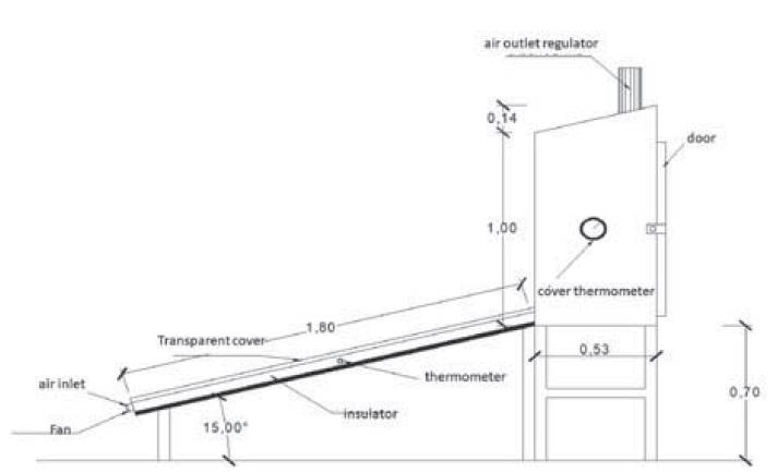 Dryer consists of solar flat plate air heater of 1mm, insulated drying chamber provided with chimney for exhaust air. Figure 1, shows the schematic view of the experimental setup. Gross dimension of the solar collector is 0.5 m x 0.5m x 1m and height of 0.7m. The solar air heater consists of V-corrugated absorption plate painted with matt black color, wood was used as insulation on the sides and top, a glass plate sealed with silicone, inclined at 15°, at one end of the collector, a fan hole and on the sides, a photovoltaic plate that provided solar energy. In fact, both the collector and the dehydrator were painted white on the outlet and inlet, covered with aluminum sheet; in the inlet, there were five trays and distributed with a distance of 15 cm among them. The tray was made from an aluminium wire mesh and fixed to the frame inside the drying chamber. Outlet air from collector enters into the drying chamber at the bottom. Then it flows in the upward direction through the drying material. The chamber was insulated from all sides except the top. The chamber was proved with chimney for exhaust air. The height of the chimney was 0.25m. These are the aspects that contemplate the construction of the solar dehydrator for fruits (Sivipaucar, Curo, Huancahuari, Llantoy & Valderrama, 2008; Condori, Echazú & Saravia, 2006; García, Justinovich, Angel & Heredia, 2015).