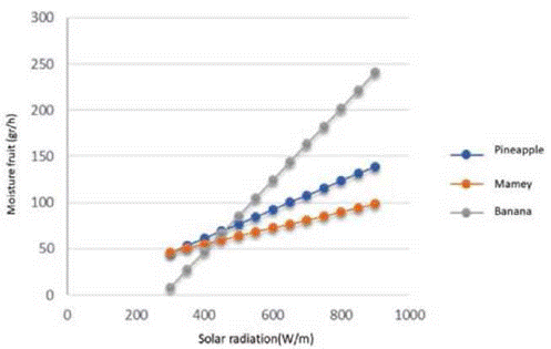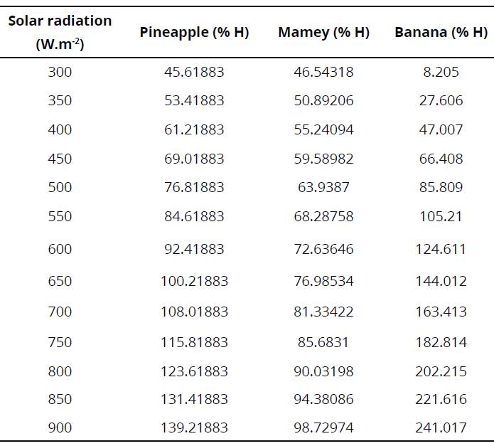Figure 3, shows the moisture variation as a function of solar radiation in the evaluated fruits: pineapple, mamey and banana, respectively.
