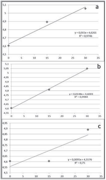 Figure 4: Shelf life for dehydrated fruits. a) mamey; b) banana; c) pineapple.