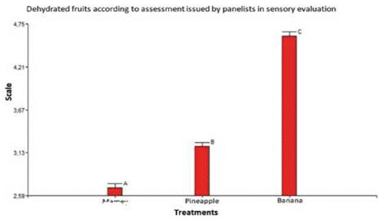 The attributes determined were as follows: sweet, appearance, color and taste; these were calculated based on the Infostat software, which have allowed that the most relevant characteristics in the attributes are in their respective order for the banana, pineapple and mamey dehydrated fruits, respectively (Figure 5).