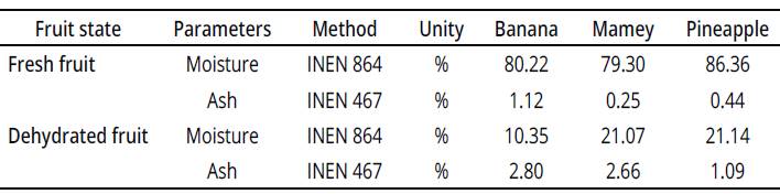 It is known that the ash percentage in the case of pineapple (0.44%) increases to an average of 1.09, in the same way, mamey (0.25%) increases to 2.66%, in the case of banana from 1.12% to 2.80% which indicates that in banana fruit, the ashes percentage are higher (Table 2).
