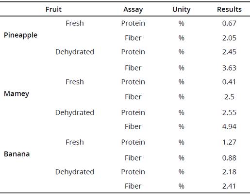 In this sense, protein and fiber content, it was observed a significantly increasing in mamey before and after dehydration stage. Is believed to be an outcome of fresh pineapple with 0.67% protein and fibers in 2.45% in its fresh stage, in addition, in dehydrated stage, had achieved an increasing of 2.45% and 3.63%. The mamey fruit with 0.41% proteins and fibers in 2.5% in its fresh stage, in its dehydrated stage, had achieved an increasing of 2.55% and 4.94%, respectively. And finally, in banana with protein content at 1.27% and fibers at 0.88% in their fresh stage, dehydrated stage, had achieved an increasing of 2.18% and 2.41% respectively.