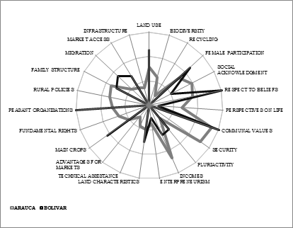 The indicators that belong to this heritage show how rural people try to overcome the challenges that normally they suffer. Security and hence violence are one of the indicators. As it has been debated, this is a huge problem in Colombian countryside, even though, according to the answers, security is ignored as an important problem in the regions interviewed. A possible reason for that perception is because the government since 2012 is involved in peace talks with the Fuerzas Armadas Revolucionarias de Colombia (FARC-EP) to achieve a consensual solution to the internal armed conflict that mainly rural areas have suffered for more than 50 years (Zerda-Sarmiento, 2016).