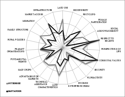It is important to emphasise the problem of the transport network that affects these regions, as well as several secondary and tertiary roads in small Colombian cities. Even though the infrastructure was ranked at a medium level, the peasants from Gutierrez and Santander remark that the unpaved roads generate a kind of isolation to reach markets and to receive the benefits of the public services. That is why the Advantages for Markets indicator are qualified at a low level in Santander. Equally, the condition of the roads network hinders the access to the benefits of the beautiful landscapes and natural reserves in their surroundings.