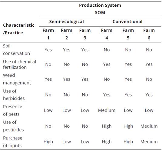 Therefore, farms were grouped according to the implemented treatment obtaining a group of 14 farms under a conventional system and another group of 10 farms under semi-ecological system. Finally, three farms from each of these groups were randomly selected to obtain a total of 6 farms, which were constituted as the study area of this research. Additionally, this last reduction was established based on the evaluation guide of soil quality and soil health taking a minimum 3 measurements per each soil management (Rosales, Pocasangre, Trejos, Serrano, Acuña, Segura, Delgado, Pattison, Rodriguez & Staver, 2015). The type of treatment and description practices in each evaluated farms are listed in Table1.