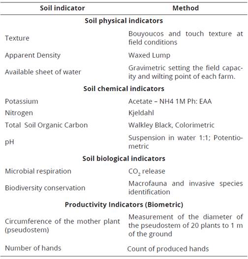 A low variance among collected data was mainly caused by a high relation among obtained values per farm. The inclusion of soil indicators related to the soil biological activity became in the first analysis component (SOC%, total N, biodiversity conservation, microbial respiration, respectively) is highlighted, and remarks the importance of these soil indicators for the performance of productive characteristics for plantain crop.