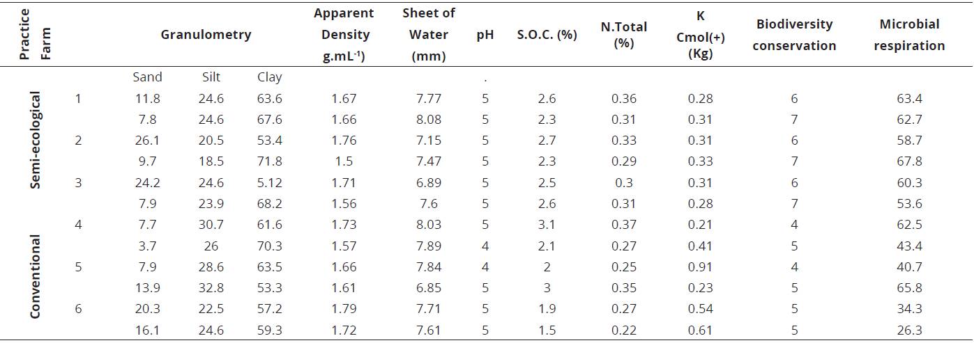 According to Verhulst, François, & Govaerts (2015), the semi-ecological practices modify the soil quality. However, these changes depend heavily on the environmental context, such as temperature and rainfall. Phenomenon that would explain why the significant difference among treatments is low, due to the similarities of the above conditions among farms.