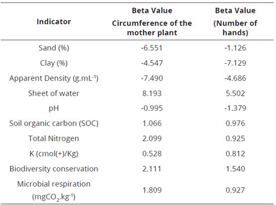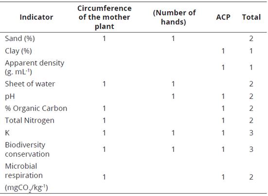 Table 6, summarizes the results and defines the soil indicators that best explain the biometric characteristics throughout the counting of occurrences in each of the statistical techniques used (linear regressions for the circumference of the mother plant, linear regressions for the number of hands and ACP), choosing those that appeared in 2 of the 3 evaluated techniques.