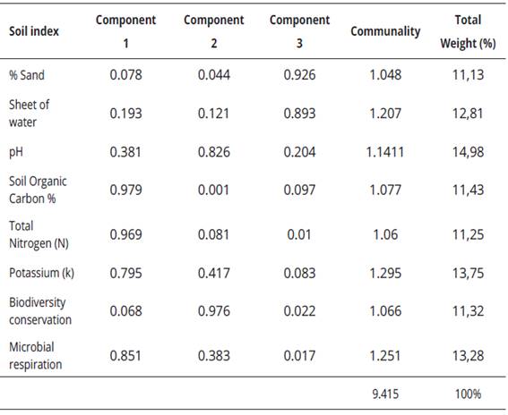 In the calculation of commonality for each CMD indicators, the relative importance of each soil indicator is demonstrated with respect to the three major components, these communalities helped to define the weights of each soil indicator within the construction of soil quality index (Table 8).