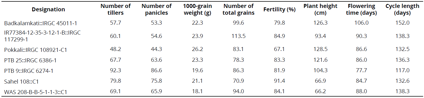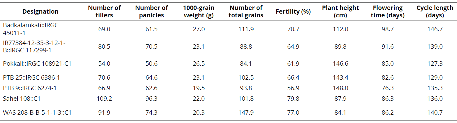 Under semi-controlled conditions in the field, four genotypes exhibited a high frequency of resistant rows compared with resistant check Fedearroz 2000: Badkalamkati, IR77384-12-35-3-12-1-B, Pokkali, and PTB 25. The genotypes PTB 9 and WAS 208-B-B-5-1-1-3 exhibited 50% and 20% of susceptible rows, respectively. And, the total number of rows of Sahel 108 was intermediate. None of the genotypes tested was as susceptible as Bluebonnet 50 (Table 2). Important traits for breeding purposes (Number of tillers, Number of panicles, 1000-grain weight, Number of total grains, Fertility, Plant height, Flowering time, and Cycle length) are shown in Tables 3 and 4.