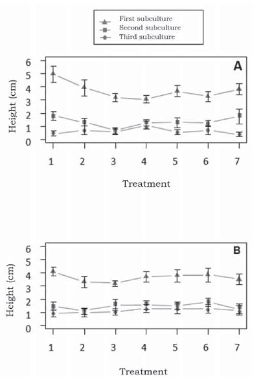 Although no significant differences for the height variables between treatments and control were found during the subculture stage, in this last one, explants reached a higher height in average, i.e. 5 cm and 4 cm in the MS and the WPM media, respectively. In the following subcultures the height reached in these apical sprouts was lower for all treatments (Figure 2A and 2B). These results agree with what has been reported by Rohim, Wanas, Abou-Aziz, El-Hamid & Abd (2013), for the "Hass" cultivar; however, for this last one a growth decrease was found only in the sixth subculture (from 3.8 cm to 1.47 cm).