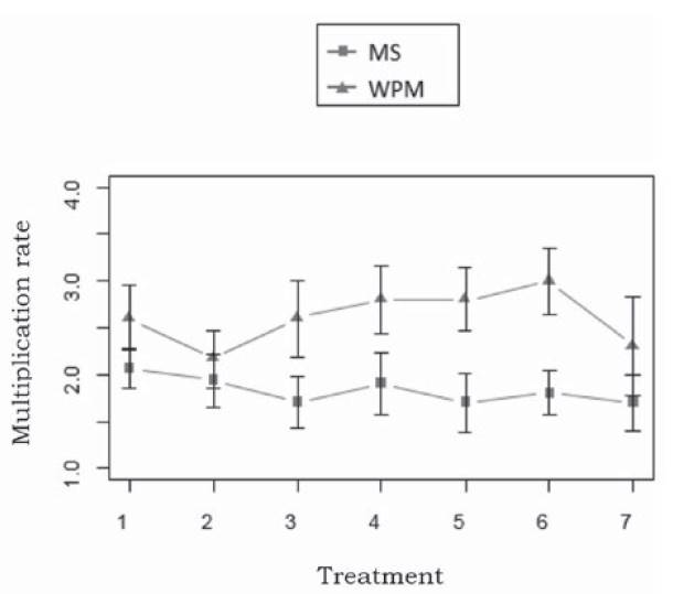 Figure 3: Multiplication rate in the MS and in the WPM media with different growth regulator combinations and control
