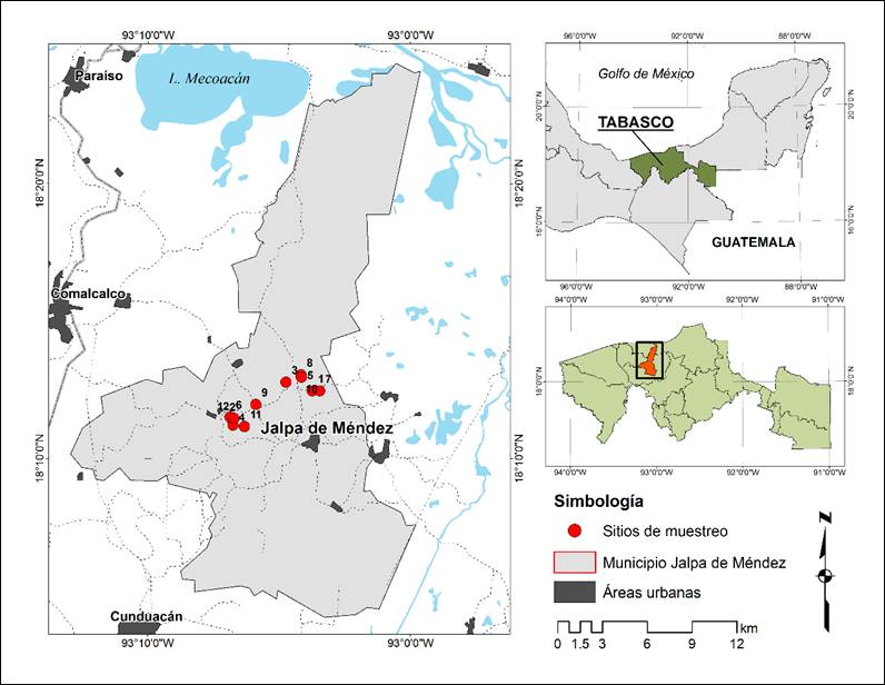 The research was carried out in the communities Iquinuapa, Hermenegildo Galeana and Soyataco belonging to the municipality of Jalpa de Méndez, Tabasco-Mexico, places that are located within the geographical coordinates 10º 33´ N and 93º 45´ W (Figure 1).