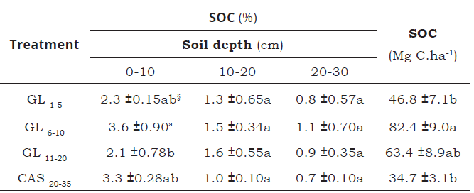 The C/N ratio in CAS is also significantly similar to the grassland systems (GL) (Table 2), a consequence of high soil spatial variation. Regarding the vertical distribution by treatment of SOC, in fact, was significantly higher in soil depth of 0-10 cm for the following treatments: GL10, CAS35 and GL5 (3.3 mg of C. g-1), respectively, among which there was no statistical difference (Table 3). The GL20 treatment performed the lowest SOC percentages (being 21 mg of C. g-1). For soil depth of 10-20 cm and 20-30 cm, the SOC did not present significant difference for each treatment (Table 3), being in any case, significantly lowest to those for edaphic surface horizon.