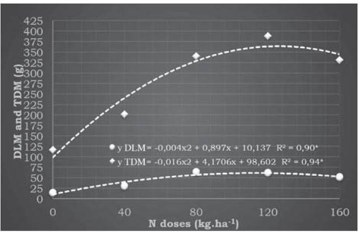 Dry leaf matter (DLM) and total dry matter (TDM) of camu-camu plants showed significant quadratic responses in relation to increasing N doses (Figure 1). It was observed that for TDM, the N dose of 128 kg.ha-1, provided the maximum value of 365.38 g, and for DLM, the N dose was 112 kg.ha-1, reached a maximum value of 60.50 g, respectively.
