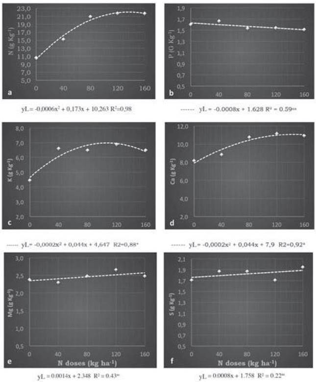 Figure 2: Effect of Nitrogen doses applied via fertirrigation on N (a), P (b), Κ (c), Ca (d), Mg (e) and S (f), contents of camu-camu leafs with 270 days after planting (DAP). 1.87 g.kg-1, respectively.