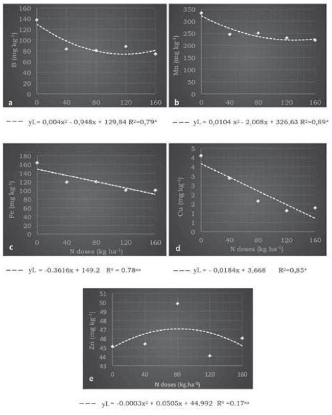 Alternatively, Fe and Zn leaf contents had achieved a non-significant linear response, differing from the response found for Cu content, which showed a significant relation to increasing N doses (Figures 3c, 3e, 3d). The mean leaf contents of Fe and Zn, were 117.5 and 46.78 mg.kg-1, respectively (Figure 3c). Regarding Cu content, a decrease of 3.67 mg.kg-1 to 0.72 mg.kg-1 was observed with increasing N doses (Figure 3d).