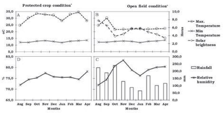 Therefore, the maximum temperature under protected conditions exceeded, in the months of October 2014 and March 2015, up to 12 °C the ones registered in the open field condition. On average, a difference of 8.7 °C was observed among two conditions (30.8 and 23.2 °C Protected and Open Field, respectively). Minimum temperatures showed no significant differences. The intensity of solar brightness showed a decrease at the beginning of the flowering stage, between the months of October - November 2014 and at the end of the vegetative cycle, which are crop periods that coincided with the rainy seasons. The indoor environment was drier, reaching differences of up to 5% in October - November 2014 and March 2015 (Figure 1).