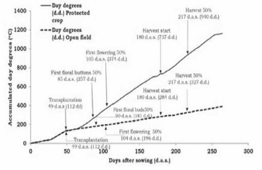 The d.d. during the crop vegetative period, showed under protected condition, in flowering stage and in the 50% of the initial flowering, that it exceeded in 137 (53%) and 239 (64%) d.d. respectively to those registered in the open field condition (Figure 2). The data presented a normal distribution (Kolmogorov-Smirnov p>0.05) and significant statistical differences among two groups, according to t-student and non-parametric Mann-Whitney tests (p<0.05).