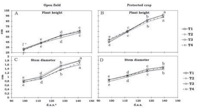 Under the Protected crop condition, plant height and RGR-Height presented the highest values over time, with significant statistical differences (p<0.05), exceeding on average 24 cm and 19 mm per week, respectively comparing to those developed in the Open field condition. The stem diameter and their RGR, on the other hand, were larger in the Open field condition, exceeding on average 7% and 34%, respectively the Protected crop condition, presenting a difference in stem diameter of 17% at the end of the vegetative cycle (Figures 3 and 4).