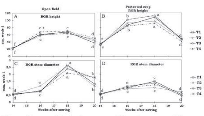 The plant height differences among the two evaluated conditions were mainly due to the etiolation caused by the sun-light decreased that was caused by the plastic cover in the protected crop condition. In the open field condition, the RGR-Height stabilized from the 16th week and decreased at the end of the vegetative cycle due to photosynthate translocation, so a stem diameter, fruit production and filling could increase. Under Protected crop condition, RGR-Height did not stabilize and started to decrease from week 18th, affecting the stem diameter, producing thin and flaccid bell pepper plants (Figures 3 and 4).