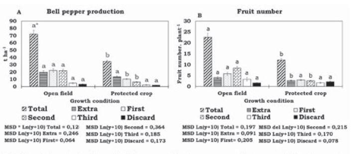 With respect to the obtained yields in the present research, compared with those reported by Albuquerque et al. (2012), where the maximum production of bell pepper (23.2 t.ha-1) was obtained by applying the highest dose of potassium (120 kg.ha-1 K2O); the best treatment with 40 kg.ha-1 less K2O, resulted in a yield of 53 t.ha-1 (72 and 35 t.ha-1 in Open field and Protected crop conditions, respectively. Figure 5). In fact, in a previous work, Casilimas et al. (2012), in the Bio-Systems Center of the Jorge Tadeo Lozano University of Bogota-Colombia, obtained yields with bell pepper cv. Nathalie of 1.9 Kg.plant-1 with 15.2 fruit.plant-1 and 2.5 plants.m-2, under glass covert with controlled conditions, surpassing the obtained yield in 0.6 kg and 3 fruit per plant, with three (3) plants.m-2 under plastic cover in the present study (1.3 kg and 12.1 fruit/plant). However, a lowest yield in 0.9 kg and 7 fruits per plant than those obtained in the Open field condition (2.8 kg and 22.6 ruit. plant-1). With another cultivar such as Lirica, they obtained 3.3 Kg.plant-1 with 22.3 fruit, which shows the importance of having a certification, in face of the competent authorities, of the materials behavior commercialized in Colombia, in different environments for which they are recommended.