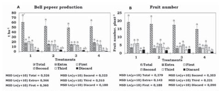 The effect of two crop conditions on total fruit yield, showed significant statistical differences (p<0.05), being 52% higher than those produced under Open field condition. The number of extra, first and second fruit variables was higher in 28, 31 and 30%, respectively (Figure 5). The effect of fertilization treatments on yield and number of fruit per plant, did not present significant statistical differences (p>0.05. Figure 6).