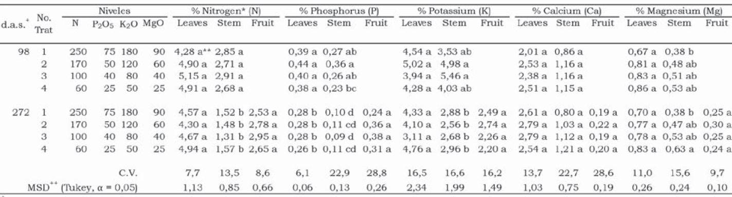 * d.a.s. : Days after sowing. *Values reporte don dry basis. Methods for N determination: EPA 351.3 modified. For P: closed digestion nitric: peroxide: wáter (5:12)/Spectrophotometry. K. a and Mg: closed digestión nitric: peroxide: wáter (5:12)/ Spectrometry of atomic absortion. **Means with same letter in each column, do not present significant statical differences (Tukey, p>0.05) **MSD minimal significant difference.