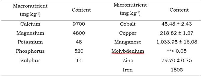 Table 4: Minimum and maximum nutrient contents determined in the foliar tissue of murici plants cultivated in substrates containing increasing doses of powdered basalt at two grain sizes.
