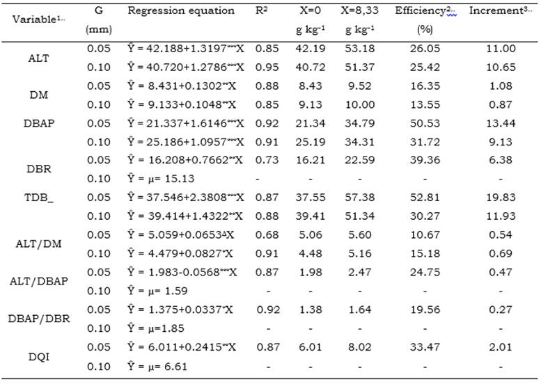 The DBR at grain size Ø < 0.05 mm increased in a linear mode as the application rates increased. This differed from DBR using grain size Ø < 0.10 mm, which did not show any doses response. According to Pinheiro et al. (2004), physiological characteristics suggest that drought tolerance could be a direct result from greater root system development, although several physiological mechanisms may be related to this characteristic.