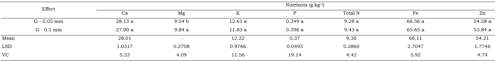 G.. Grain size; Ca.. Calcium; Mg.. Magnesium; K.. Potassium; P.. Phosphorus; Total N.. Total Nitrogen; Fe.. Iron; Zn.. Zinc; In the column, means followed by the same letter are not different from each other according to Tukey’s test at 5% probability.