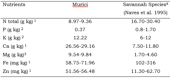 The Ca, Mg, K, P, Total N, Fe, and Zn contents obtained in the foliar tissue of murici plants (Table 4) were compared to critical levels for savanna species (Naves et al., 1995), due to the absence of critical levels for the murici plant.