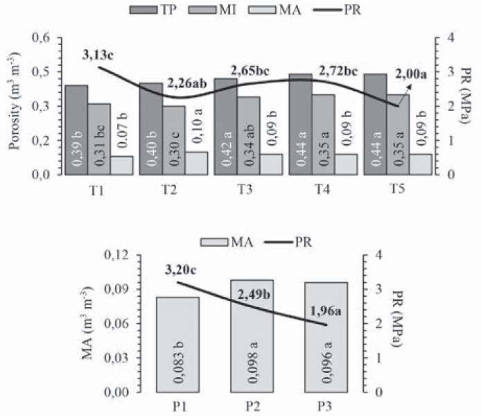 MA and PR were different with depth. The best soil physical condition was observed in the 0.10-0.20 m layer (P3), with averages of MA and PR of 0.098 m3.m-3 and 1.96 MPa, respectively (Figure 1).