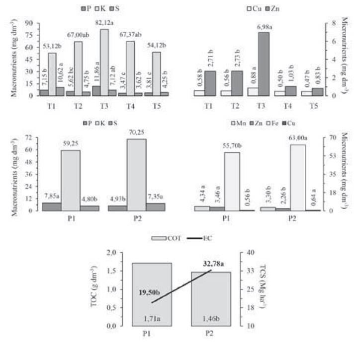 In addition, fertilizers altered the concentrations of some micronutrients in the soil with increases in the exchangeable levels of Zn and Cu in the dose of 80 m3.ha-1 of LSM were observed (Figure 2). There was no significant difference for the other treatments, however, all were classified as having high availability of Zn (> 2.2 mg.dm-3) and low for Cu (0.40-0.79 mg.dm-3). Only T3 presented medium availability of Cu (0.8-1.2 mg.dm-3).