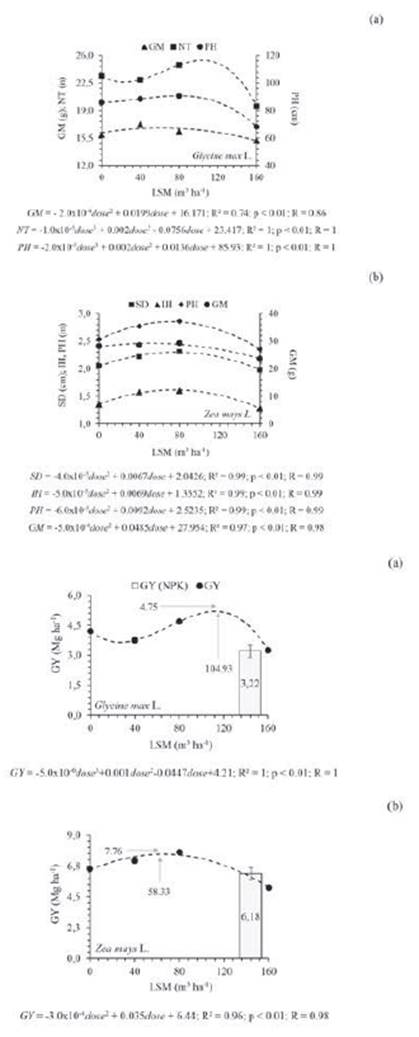 As for maize GY application of LSM positively influenced the dose of 58.33 m3.ha-1, with a maximum of 7.76 Mg.ha-1 (Figure 3b). Fertilization with NPK in maize indicated higher GY than seen in the control and doses of LSM > 136 m3.ha-1.