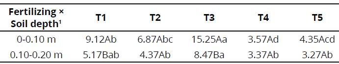 In relation to MI, means did not differ between treatments T1, T3, T4 and T5, with amplitude in micropore volume between 0.31 and 0.34 cm3. cm-3. For BD there was no significant difference as a function of the fertilizations and depths evaluated. Thus, the overall mean of1.13 Mg.m-3 may represent the condition of the experimental station in its entirety.