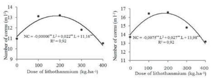 Furthermore, largest corm diameter (23.52 mm) at 150 DAP (Figure 3A), is reached with plants irrigated and fertilized with 159.42 kg.ha-1 of lithothanmium and 330 m3.ha-1 of vinasse. Doses higher than 200 kg.ha-1 of lithothanmium cause decreases in plant diameter.