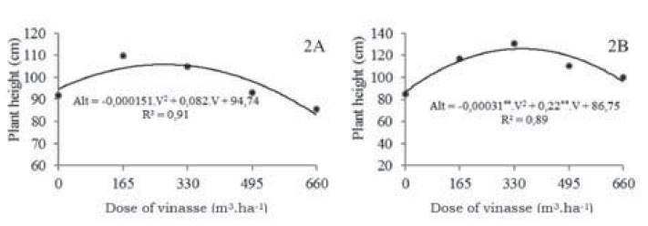 In Phase I, the maximum height (106 cm) is reached when sugarcane plants were irrigated and fertilized with 200 kg.ha-1 of lithothanmium and 270.63 m3.ha-1 of vinasse (Figure 2A). Meanwhile in Phase II, the maximum height (126 cm) is reached with 200 kg.ha-1 of lithothanmium and 351.76 m3.ha-1 of vinasse (Figure 2B). With doses of vinasse higher than 300 m3.ha-1 plant growth decreases exponentially.