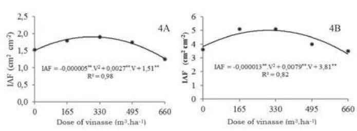 Moreover, reduction in corm diameter probably occurs due to reduction in number of plants as a consequence of high population competition in this phase. As for the influence of lithothanmium it could have been damaged because it is a rapid release product and causes depressive effect in plants, especially in soils with base saturations above 70%; this is because it increases soil pH and inhibits nutrient uptake (Evangelista et al., 2016). Maximum LAI (1.91 m2.m-2) in Phase I (Figure 4A) is reached with irrigated and fertilized plants with 291.63 m3.ha-1 of vinasse. While in Phase II (5.02 m2.m-2), it is reached when plants are irrigated and fertilized with 305.62 m3.ha-1 of vinasse and 200 kg.ha-1 of lithothanmium (Figure 4B).
