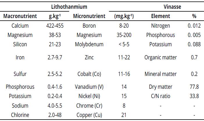 Doses of lithothanmium were manually applied during planting and doses of vinasse were divided according to the rate in which potassium was absorbed by the crop (Bachchhav, 2005). Furthermore, the chemical composition of lithothanmium and vinasse are shown in Table 1.