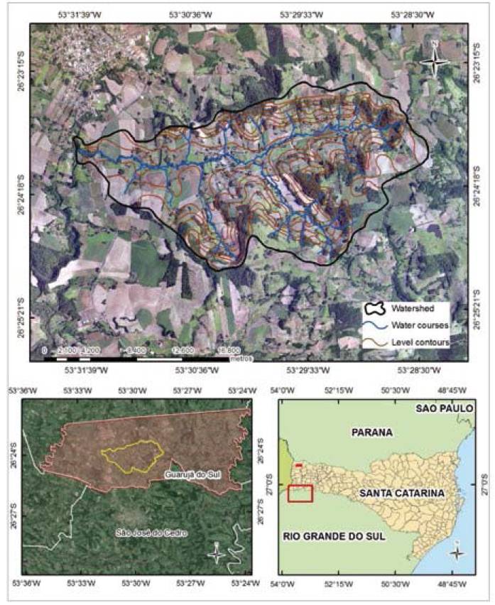 The Lajeado Pessegueiro watershed encompasses an area of 980.51 hectares. It is located in the extreme west region of the state of Santa Catarina (SC), Brazil, in the municipality of Guarujá do Sul (26°23'4''S, 53°31'15'' W, and altitude of 707 m); between the municipalities of Princesa and São José do Cedro (Figure 1).