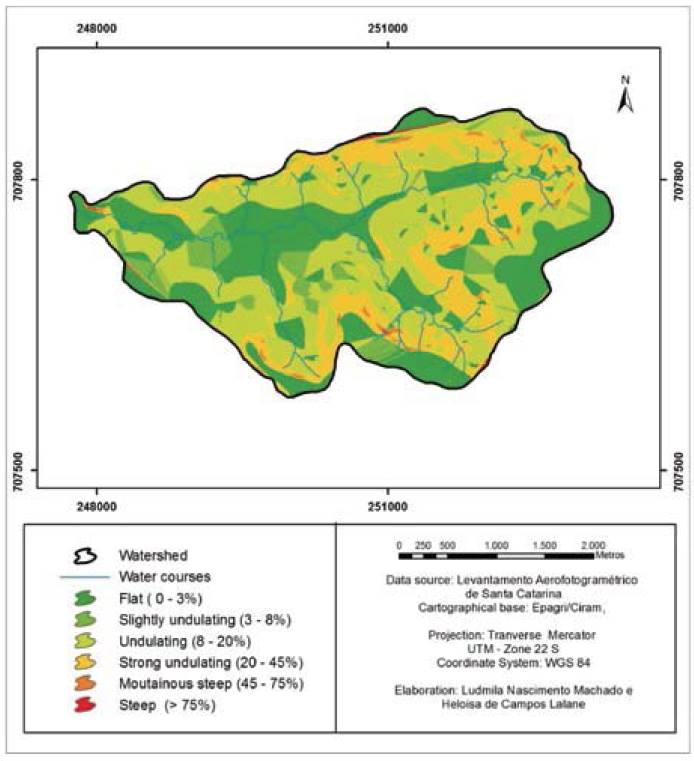 According to the slope classes found, the area of the watershed presents restrictions for agricultural use, requiring the adoption of conservation practices of land use and management, especially for the undulating, and strong undulating relief classes. However, significant portion of its area presents high potential for agriculture, especially the flat, and slightly undulating relief classes.
