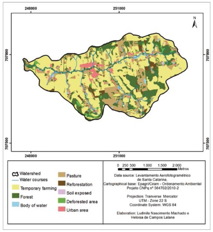 Information on the land use and occupation were also collected, quantified and plotted as a land use map. The land use of the watershed was determined according to the classes established by the IBGE (2013), through field recognition, information from farmers, and interpretation of aerial photos (scale of 1:25000) obtained by the Aero-photogrammetric Survey of the State of Santa Catarina in 2010/2011, available at the State Department of Sustainable Development (SDS/SC, 2011). These images were visually analyzed differentiating colors and textures, and the classes found were checked in the field some of them confirmed with the producers, as in the case of fallow areas. The exposed soil class is represented by areas with shallow soils interspersed with rocks, which hinders the development of vegetation. The dirty pasture class is associated with the presence of indicating plants of incorrect management, showed by images of areas with rough texture. The capoeira class is represented by areas with secondary forests at initial stage of regeneration.