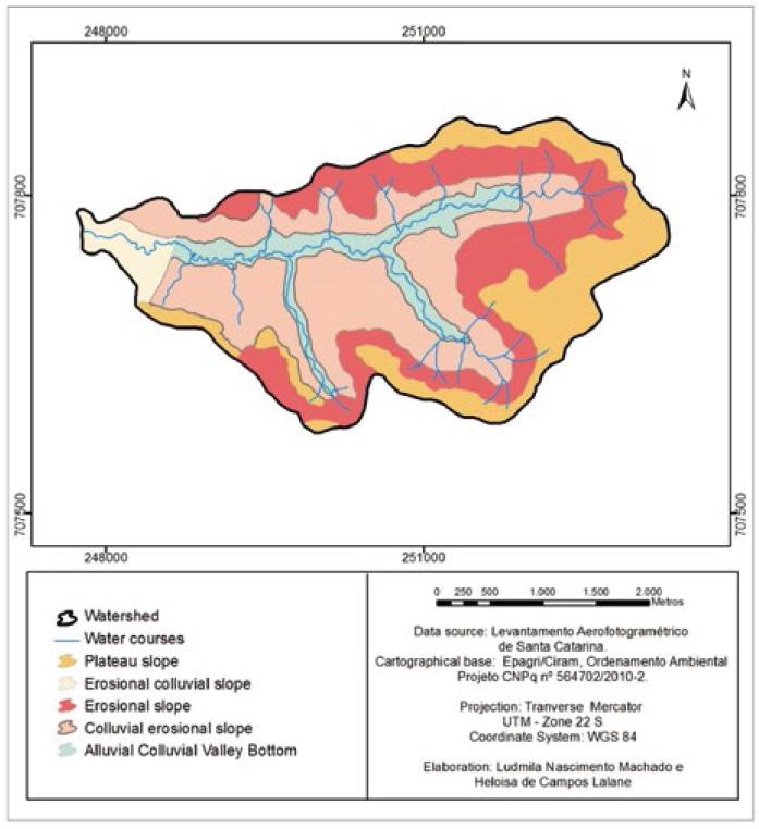 The watershed has predominance of undulating relief, followed by flat and strong undulating relief. The land of the watershed is predominantly used for temporary (annual) crops, followed by forests, and pastures. The predominant physiography in the watershed is the colluvial erosional slope, erosional slope, plateau slope, alluvial colluvial valley bottom and erosional colluvial slope. The soil classes occurring in the watershed were Red Nitosols, Haplic Nitosols, Haplic Cambisols, Fluvic Cambisols, Red Argisols and Litholic Neosols.