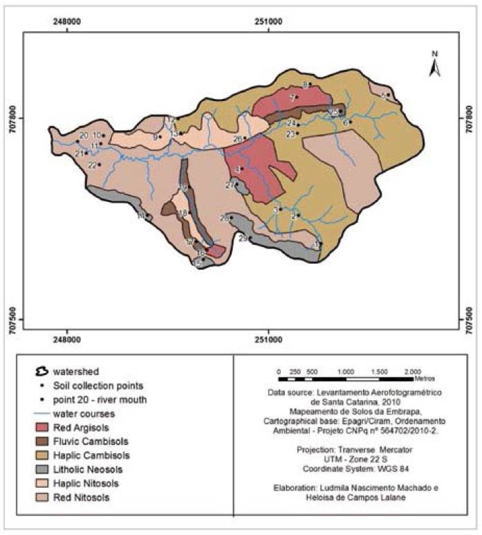 The mapping of soils, developed with the ArcGIS(r)-10.0 software, was carried out using maps of the IBGE/Epagri digital topography map collection (IBGE, 2004) with scale of 1:50000 (highways, springs, boundaries), and orthophotos with scale of 1:25000 obtained by the Aero-photogrammetric Survey of the State of Santa Catarina. The data on percentage of land use areas, slope, physiography, and soil classes were calculated using the Intersect tool Geoprocessing) of the ArcGis(r) software.