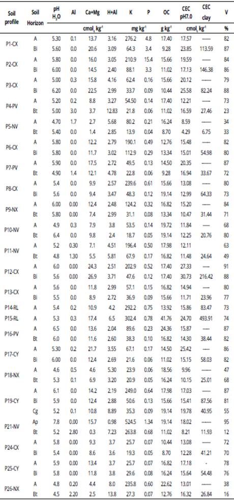 In P20 (River mouth), P22 (NV) and P23 (CX) no analyzes were performed, only field observations. P=profile, OC=organic carbon, CEC= cation exchange capacity, V%= base saturation, CX=Haplic Cambisol, PV=Red Argisol, NV=Red Nitosol, NX=Haplic Nitosol, RL= Litholic Neosol, CY= Fluvic Cambisol.