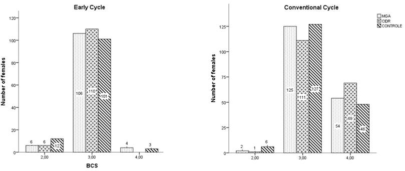 In the present study, there were no differences between the conception rate associated with BCS, since 91.1% of heifers in the early-cycle group had BCS level 3 and the conventional-cycle group presented only 1.7% of BCS level 2 (Figure 1). Gottschall et al. (2012)) found that animals with a BCS above level 2.5 had a higher rate of conception. This was also reported by Sá Filho et al. (2009)) who showed that for AIFT to obtain a minimum of 40% positive pregnancies, the mothers submitted to the protocol must have an BCS score above level 2.5.
